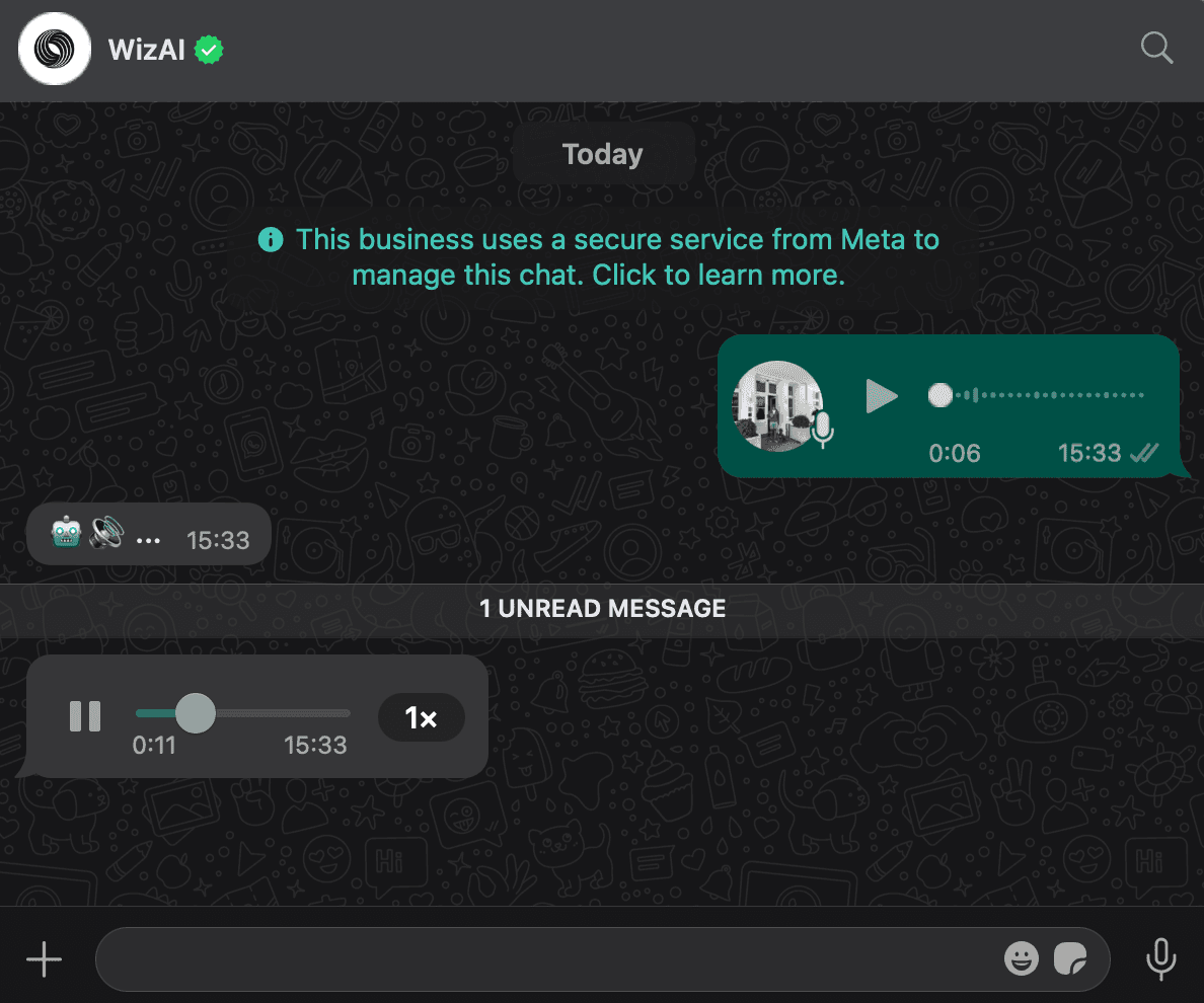 Upgrade your WhatsApp chats with WizAI's voice messaging feature. Hands-free, personalized, and accessible Artificial Intelligence communication on the go!